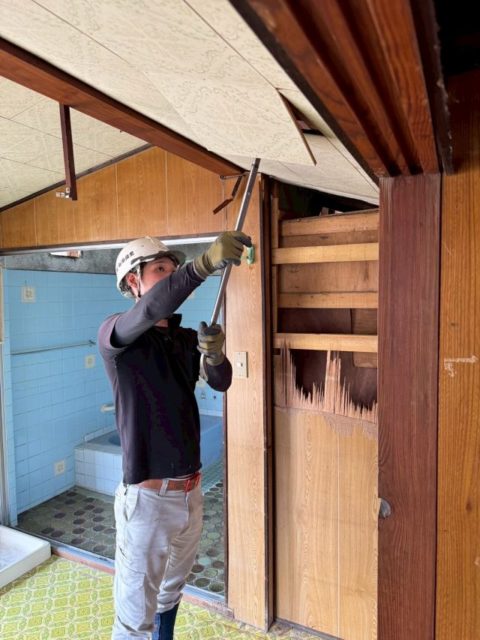 足場を架設し、室内外の残存物の撤去と内装材や外装材の解体撤去を手作業で行います。