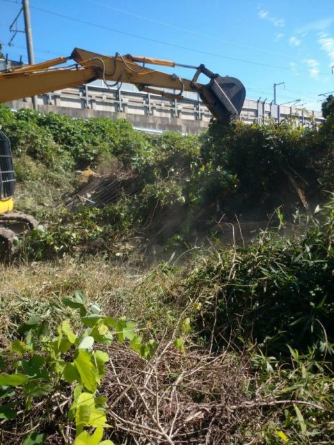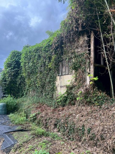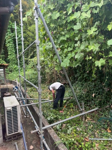 続いて足場を架設、建築物を覆っている蔓や竹を重機を使用して撤去・伐採していきます。